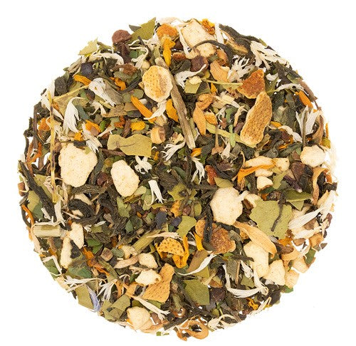 What's In your cup? Green tea, Mate, Guarana, Guayusa, Orange + Grapefruit, Licorice, Orange blossoms, Marigold + Cornflower petals, Natural flavors (organic compliant).
