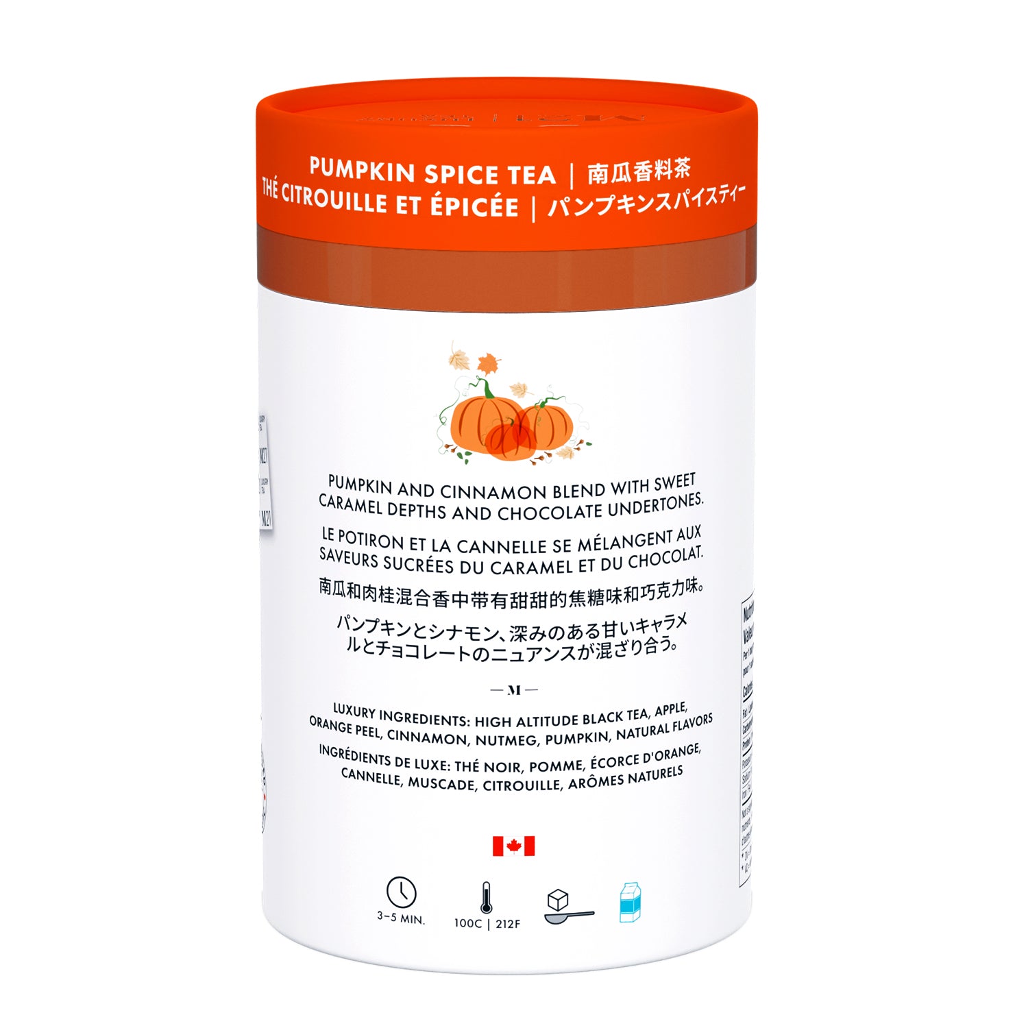 What's In your cup? Black tea, Apple, Orange peel, Cinnamon, Nutmeg, Pumpkin, Natural flavors.